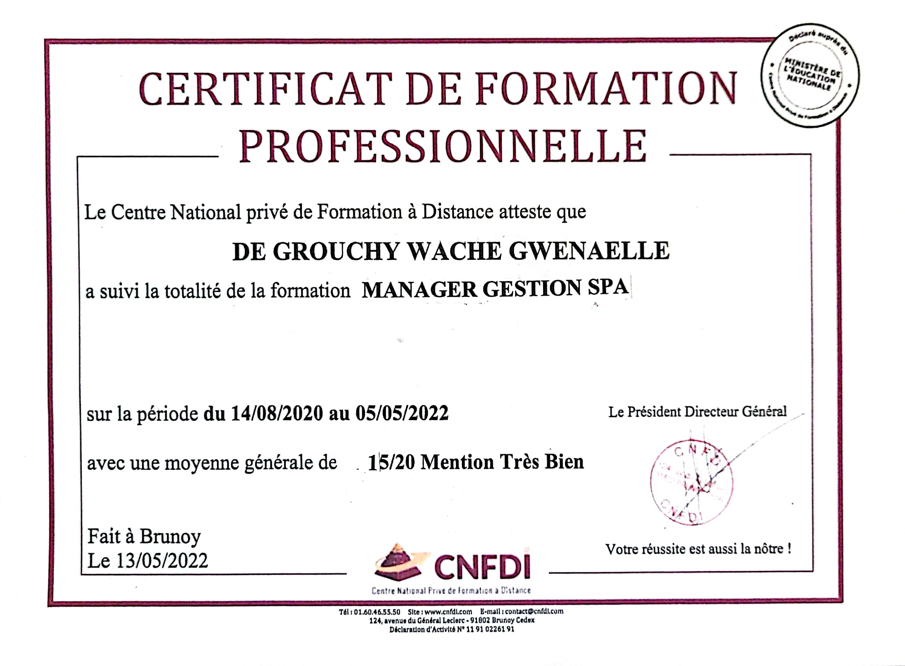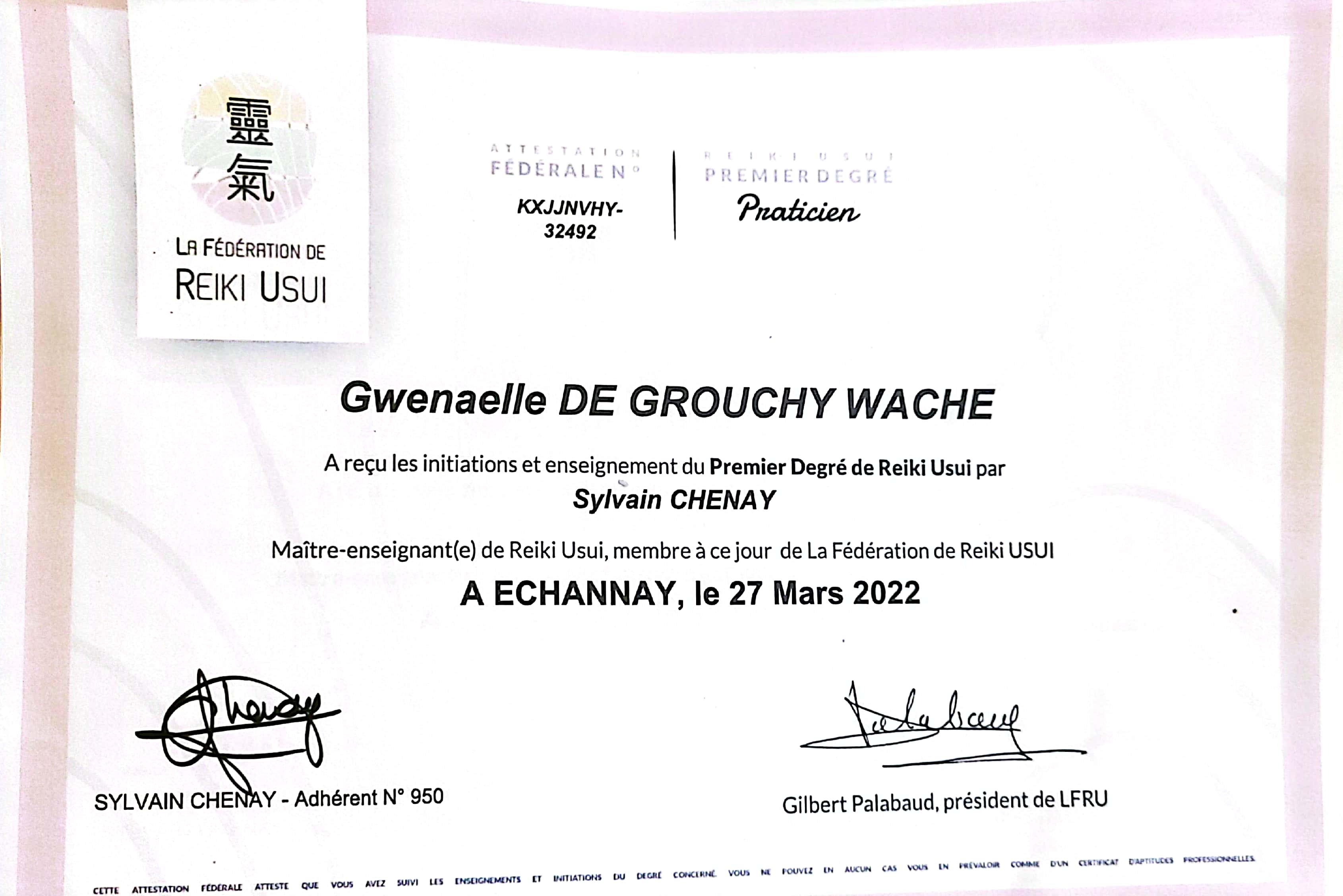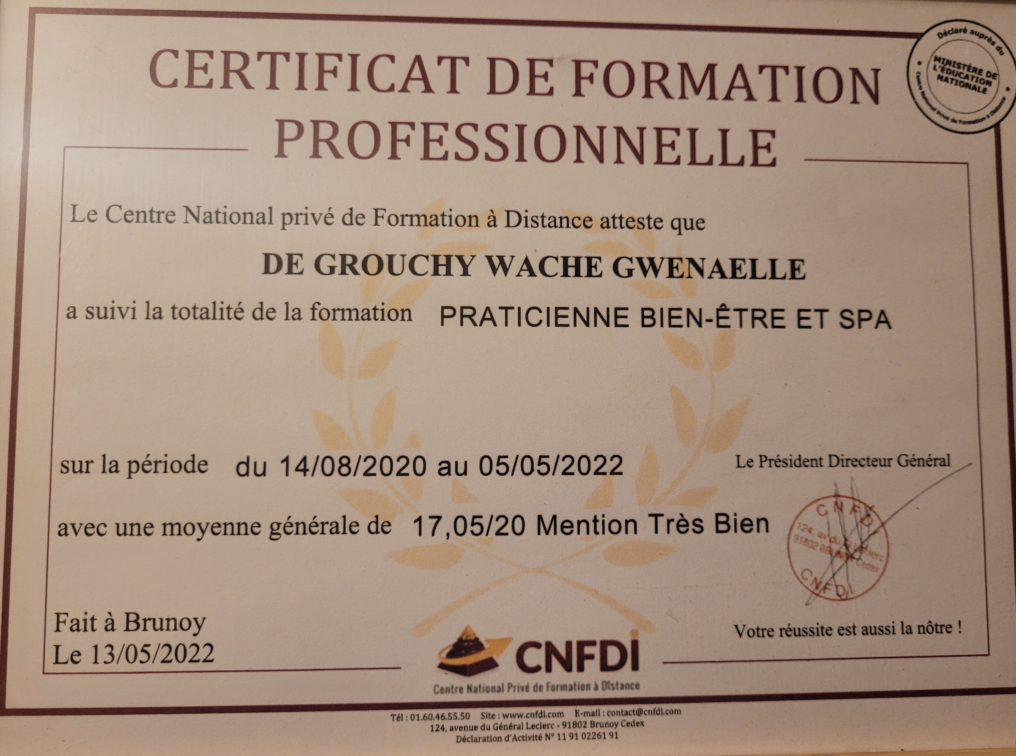 Je m’appelle Gwenaelle de Grouchy-Waché, aujourd’hui j’ai 43 ans . J’ai commencé à me reconvertir à 38 ans, suite à une remise en question. Mon parcours d’apprentissage et de certifications a duré a peu près 3 ans. Je suis certifiée, Technicienne bien-être spa et Manager gestion spa (certifications obtenues en 2022 , au CNFDI 91540 Brunoy) et Certifiée Praticienne en massages ajustés ®( obtenu en juillet 2022 a l’ecole du massage ajusté de Marie Gamain) massage femme enceinte et ses douleurs spécifiques (obtenue en 2023 à l’ecole du massage ajusté de Marie Gamain) toucher-massage ®️ personnes âgées et/ou polyhandicaps ( obtenue en 2023 à l’ecole Ifjs Savatofski). Drainage lymphatique méthode Vodder (obtenue à l’ecole française de massage en 2023). Le Kobido japonais ( obtenue en 2024 à l’ecole française de massage)et Praticienne en Reiki Usui, depuis 2022 (obtenues de 2022 à 2023).