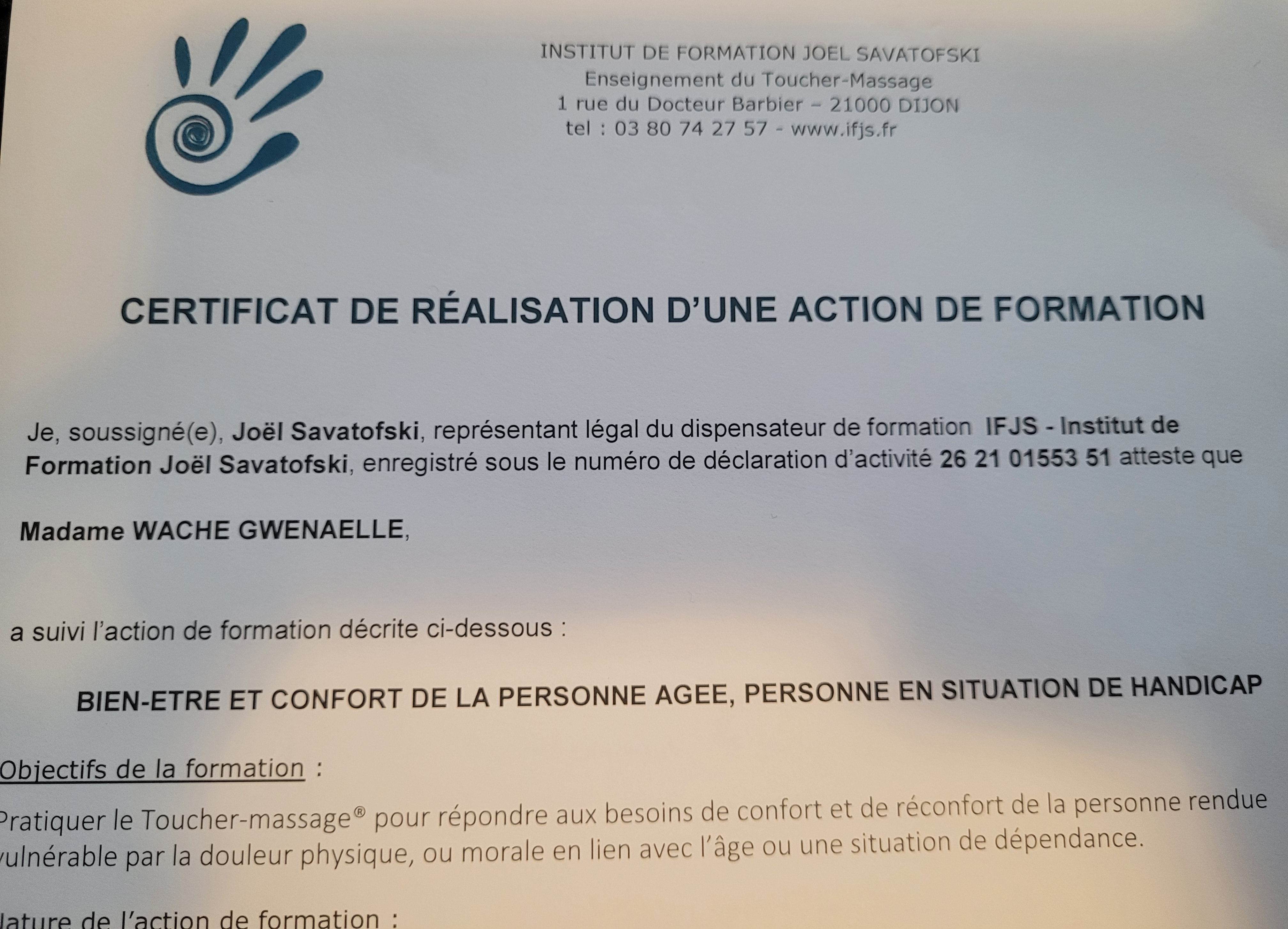 Un autre cursus de plusieurs jours spécialisés sur l’accompagnement , la Relaxinesie ® et Toucher-massage® des personnes âgées et/ou en situation d’handicap à l’école du toucher-massage ® de Joël Savatofski (kinésithérapeute, psychologue).