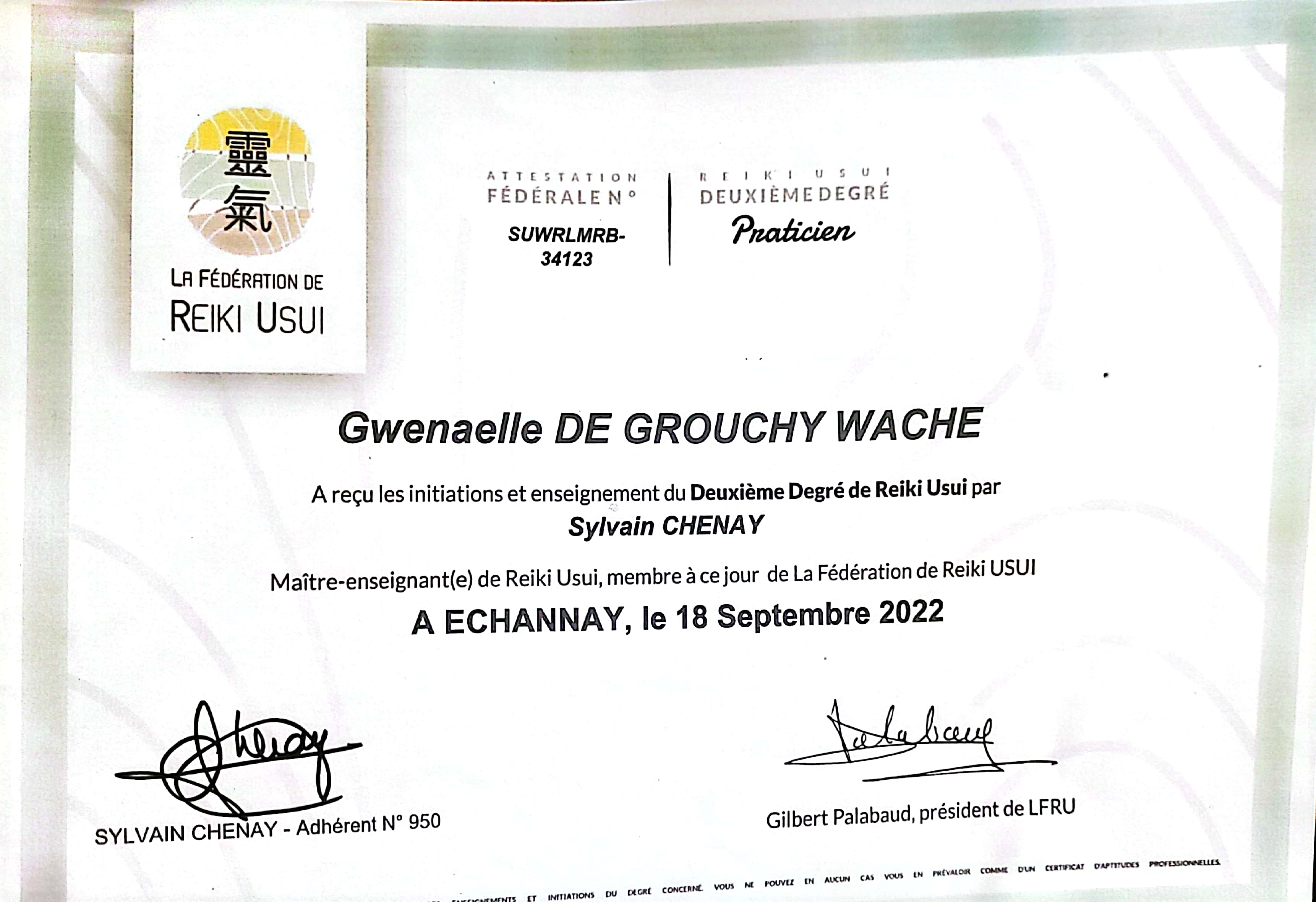 Je travaillais déjà avec les énergies des pierres et mon magnétisme et pour développer mes intuitions et pouvoir soulager certains maux, le Reiki Usui est venu naturellement à moi. J’ai passé le 1er et le 2ème degré à l’école de Sylvain Chenay à Echannay, maître Reiki et je passerai le 3ème degré très prochainement.