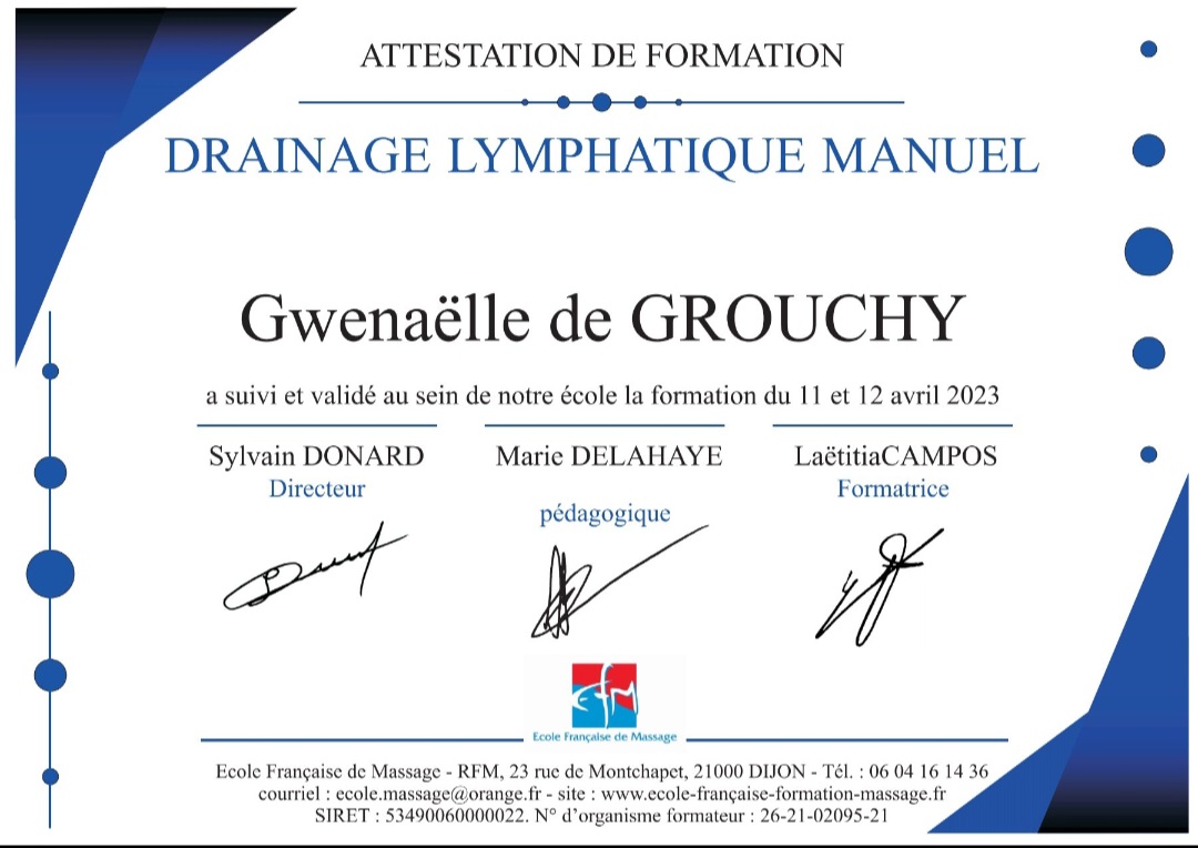 En avril 2023 , c ‘est une spécialisation et certification en drainage lymphatique manuel effectué à l’ecole francaise du massage, qui vient agrandir mon savoir-faire .