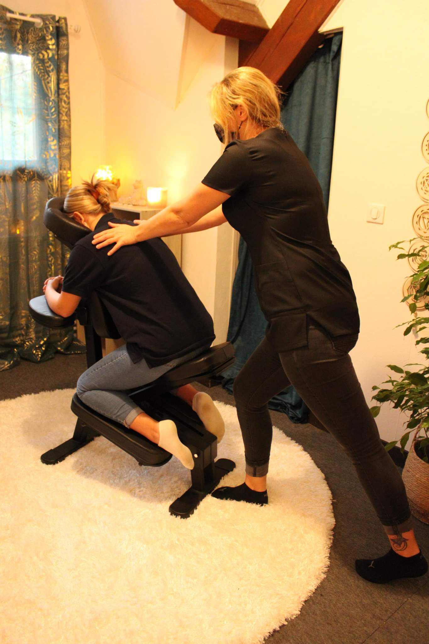 Massage anti stress, traditionnel japonais basé sur l’acupression, nommé AMMA « calmer avec les mains », réalisé assis sur une chaise ergonomique.
